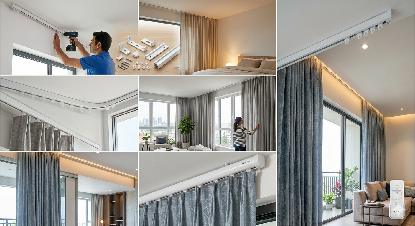 Premium curtain fittings and motorized tracks for seamless window treatments.